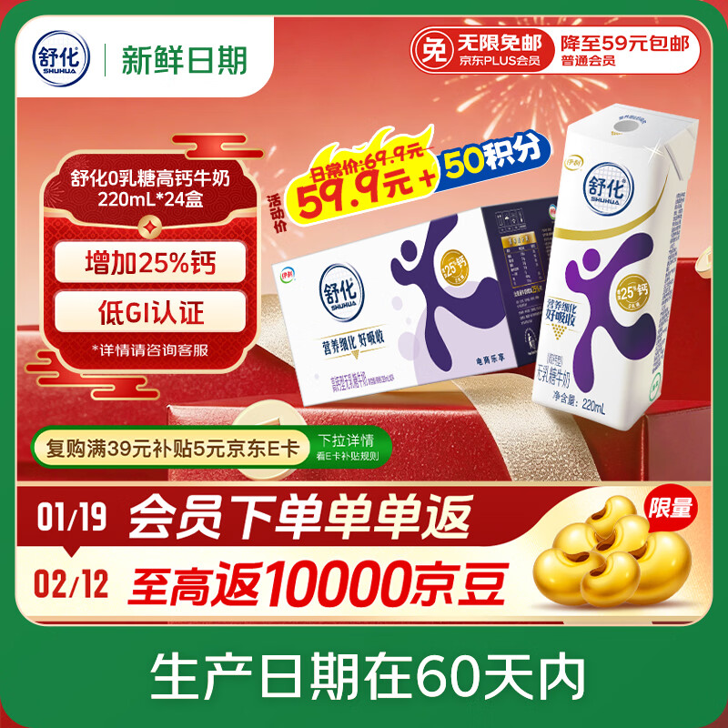 舒化【新鲜日期】0乳糖高钙牛奶220ml*24 牛奶整箱 企业团购 年货礼盒