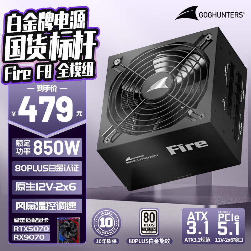 长城(Great Wall)额定850W F8白金牌全模组电脑电源(ATX3.1标准/原生PCIe5.1/自动启停/全电压/闪电加速)