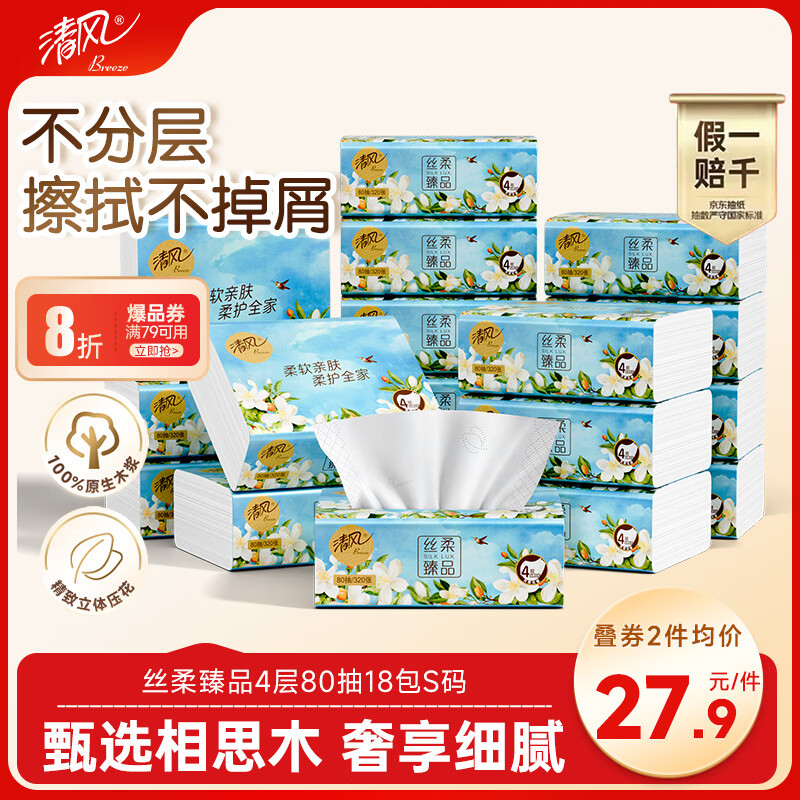 清风抽纸 丝柔臻品4层80抽*18包S码 卫生纸 餐巾纸 纸巾加厚 抽纸整箱