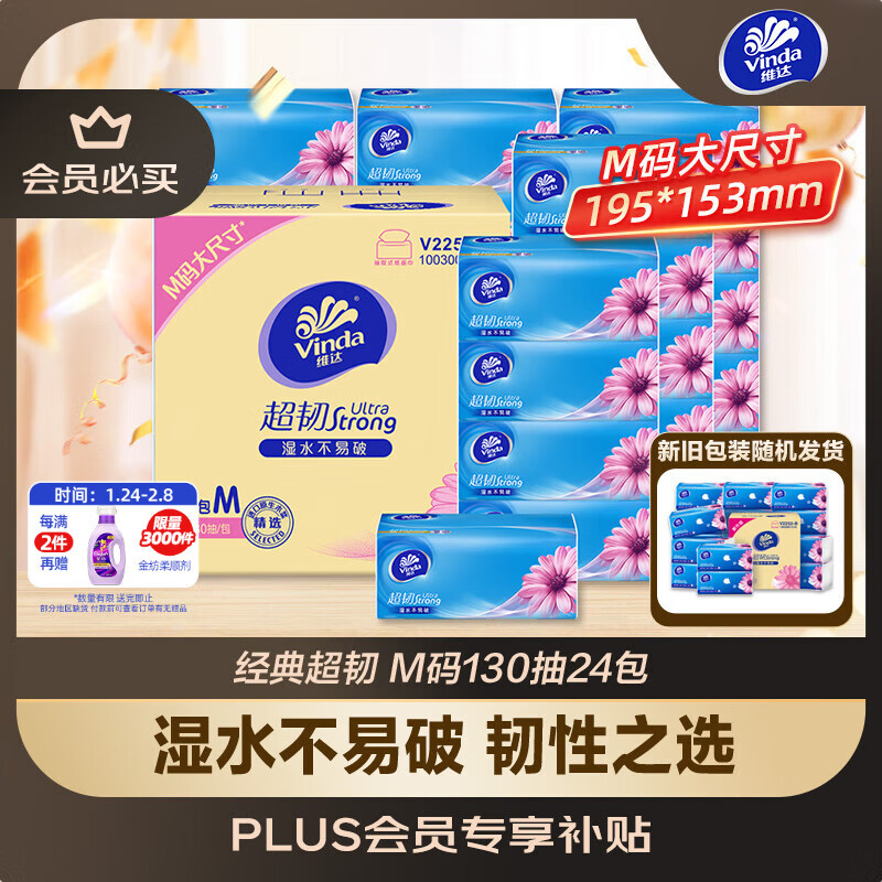 维达(Vinda)抽纸 【孙颖莎推荐】超韧3层130抽*24包M码 新旧随机 整箱