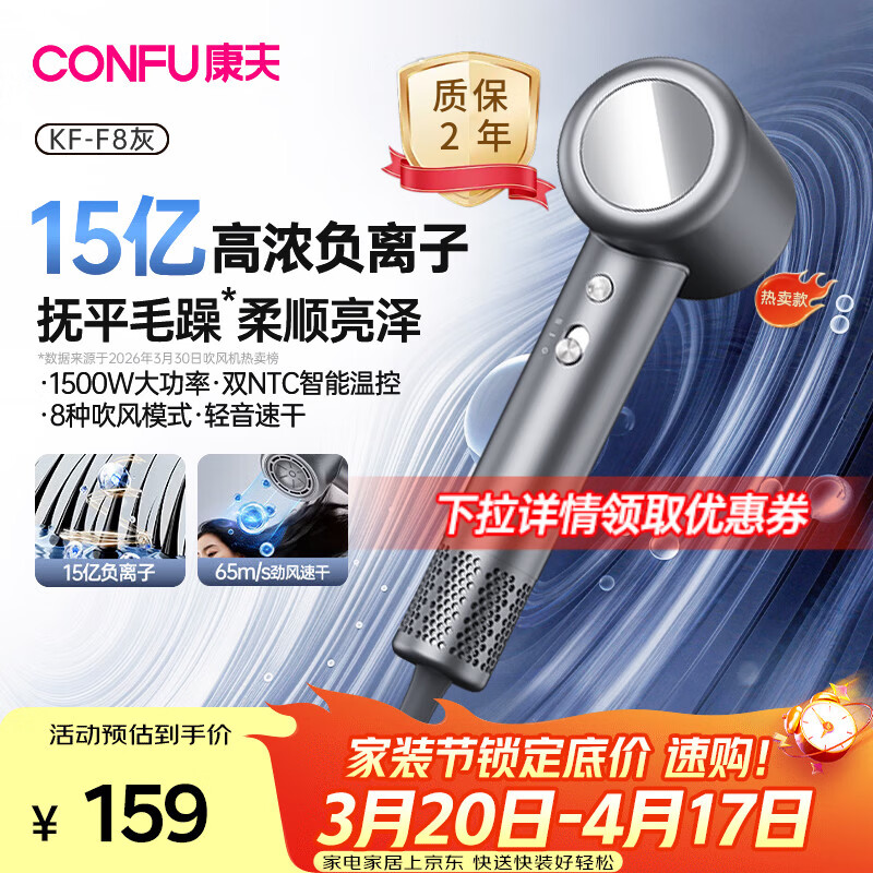 康夫(CONFU)高速电吹风机15亿负离子护发电吹风大功率速干家用大风力不伤发女士吹风筒节日/生日礼物推荐F8灰