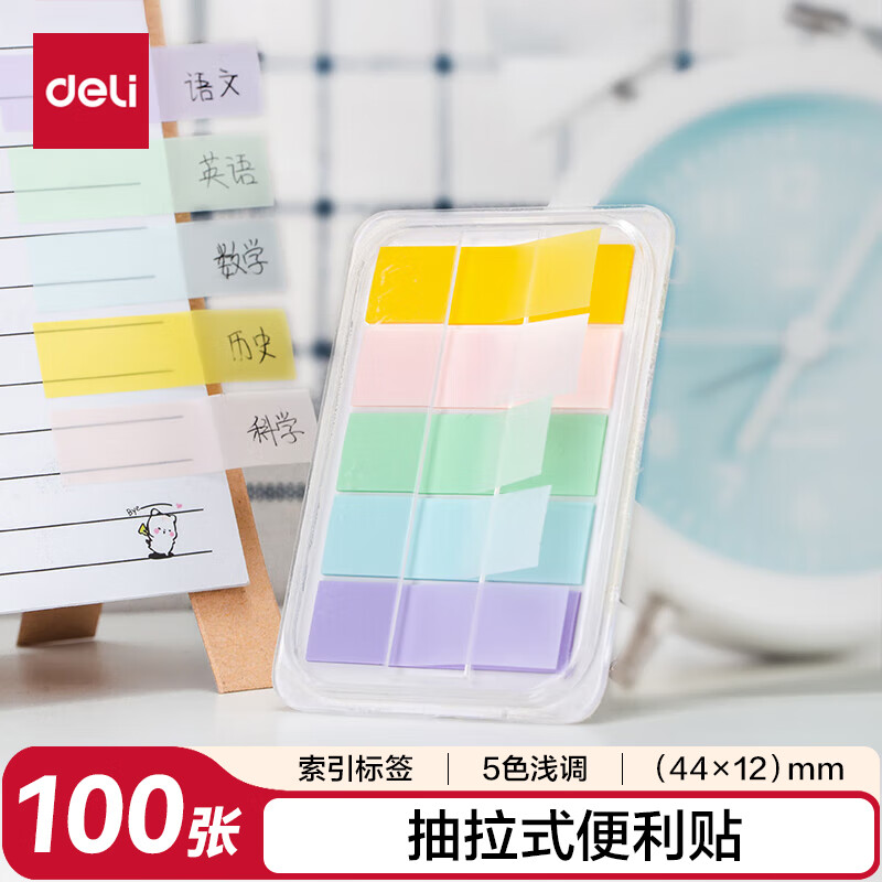 得力(deli)100张5色浅调系列淡彩荧光膜指示标签贴 44*12mm抽取式便利贴便签条记事贴开学必备 21606