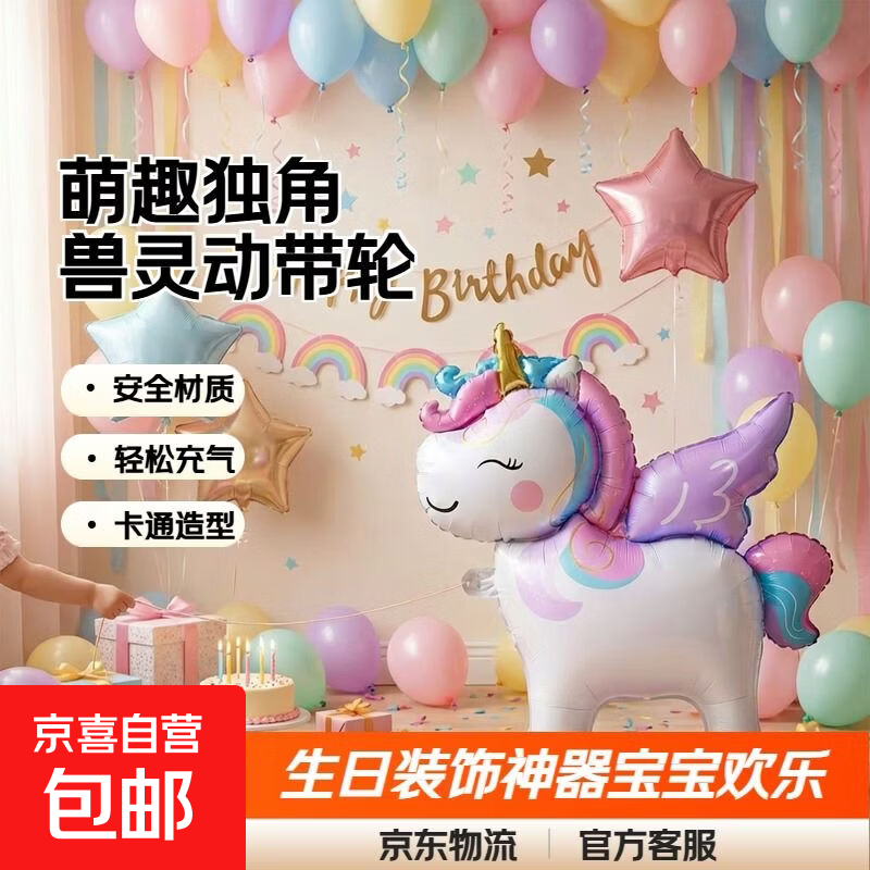 【送充气吸管】新款儿童宝宝生日带轮卡通走路动物气球装饰场景 小号带轮-飞翔独角兽