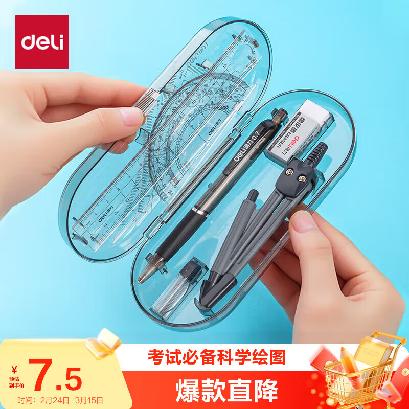 得力(deli)铅笔+铅芯+橡皮+圆规+尺子/三角尺+量角器学生开学文具中考高考绘图用品8件套 /9591A