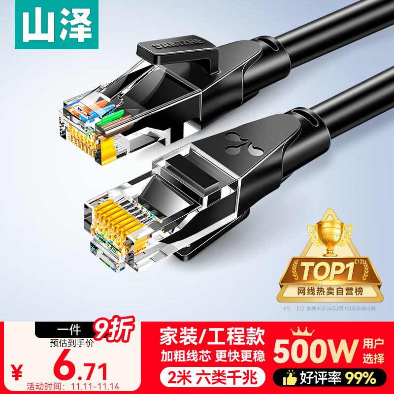 山泽 六类网线 2米千兆高速宽带线 CAT6类家用电脑路由器5g网络工程监控线8芯成品跳线2.5g黑色 WD6020