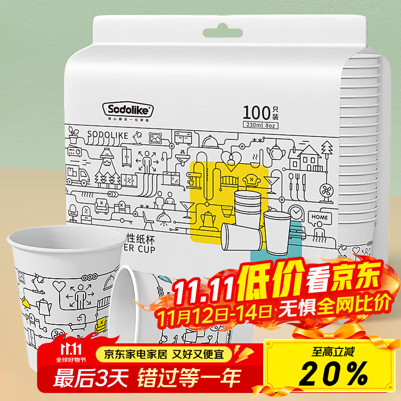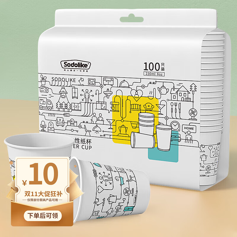 Sodolike尚岛 一次性纸杯 230ml加厚纸杯整箱100只装 办公商务家用