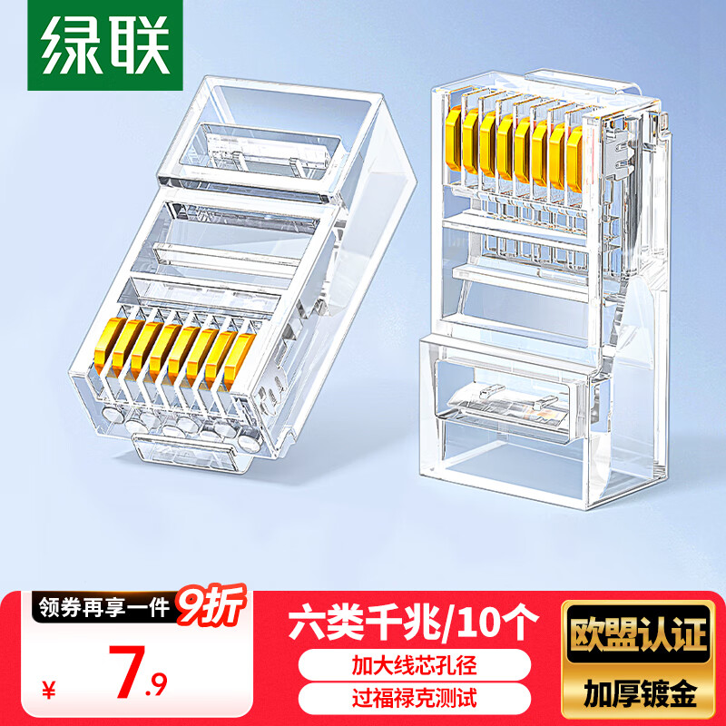 绿联六类网线水晶头 6类千兆网络接头 CAT6镀金工程级RJ45电脑连接器适用超六类万兆非屏蔽网线10个