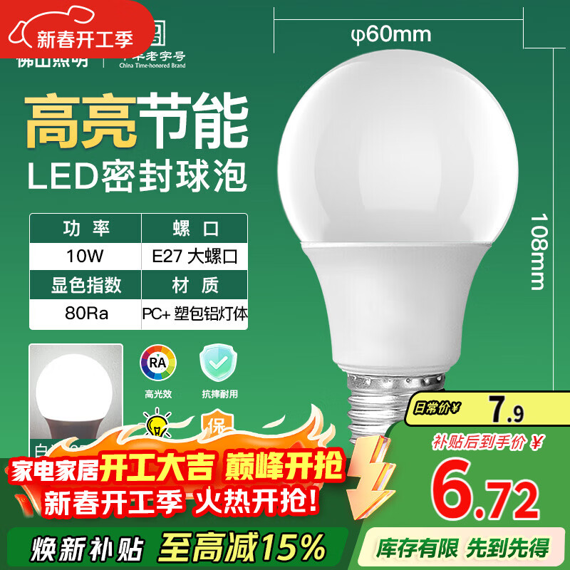 FSL佛山照明LED球泡10W大口节能灯泡E27明珠三代日光色6500K