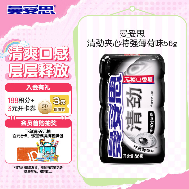 曼妥思清劲夹心特强薄荷味无糖口香糖56g约28粒 持久口气清新 休闲零食