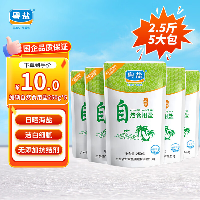 粤盐 自然食用盐250g*5袋 海盐加碘盐 无抗结剂 日晒盐 调料