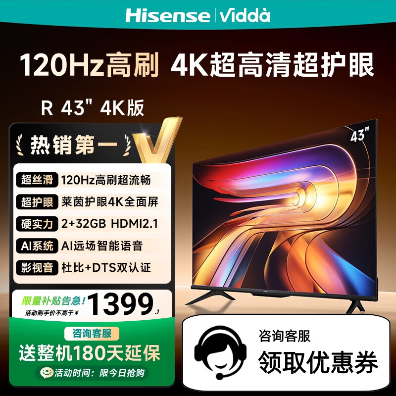 Vidda海信电视43英寸 R43 4K版 120Hz高刷 2+32G 国家补贴 智能护眼液晶游戏电视 以旧换新 43V1ND-R 43英寸