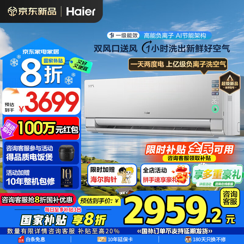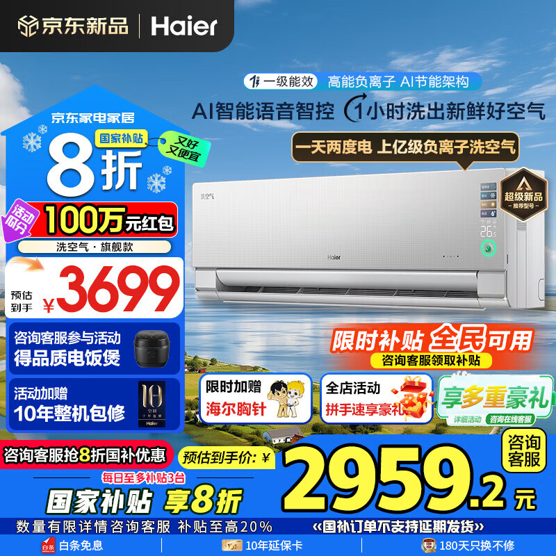 海尔空调洗空气Max 1.5匹新一级变频冷暖卧室壁挂式声源定位送风 聚合双向风智能语音 高能负离子除醛 1.5匹 一级能效 洗空气+智能语音+除空气污染物