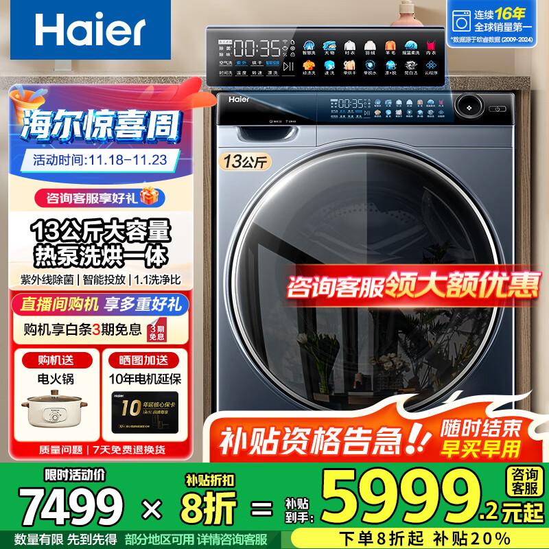 海尔(Haier)【升级精华洗2.0】13KG大容量滚筒洗衣机热泵洗烘一体机直驱变频525大筒径 家电国家补贴 精华洗2.0+直驱热泵洗烘一体+紫外除菌+智能投放