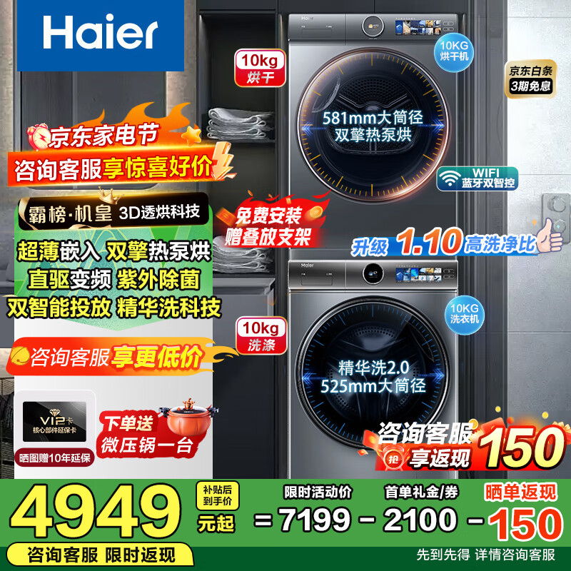 海尔洗烘套装云溪超薄洗烘一体洗衣机烘干一体4.0 10KG直驱精华洗2.0滚筒洗衣机烘干机组合套装双擎热泵386大筒径 386|三变频3D透烘+紫外除菌+精滤毛屑+双智投