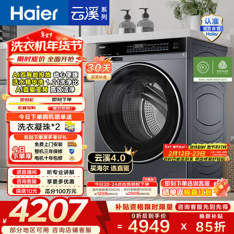 海尔(Haier)云溪4.0 滚筒洗烘一体机 10公斤全自动洗衣机带烘干家用大容量超薄 AI直驱洁净家电换新补贴582HU1 10KG洗烘一体机 滚筒