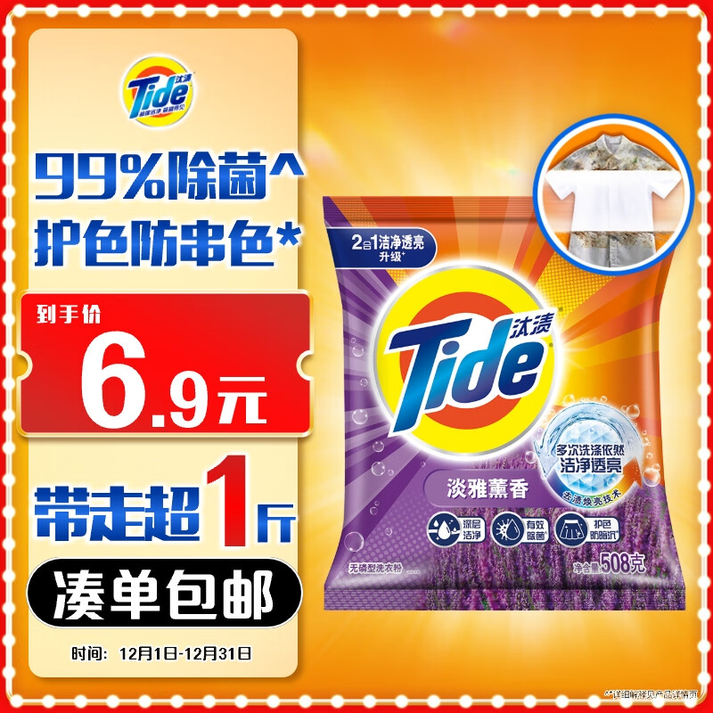 汰渍洁净透亮洗衣粉淡雅薰香508g 强效去渍 持久留香 除菌除螨 非皂粉