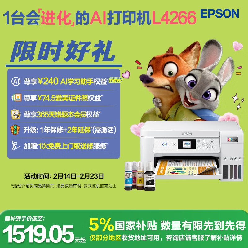 爱普生(EPSON)L4266墨仓式彩色无线多功能一体机家用/办公 AI学习打印机(打印复印扫描 wifi 自动双面 液晶屏)