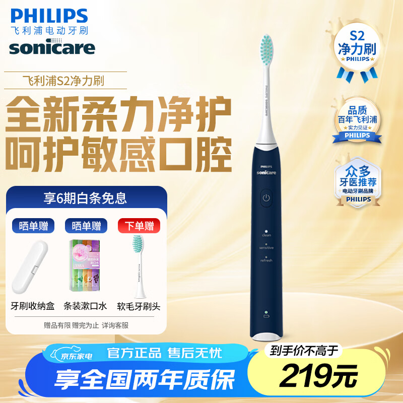飞利浦(PHILIPS)电动牙刷S2净力刷洁齿护龈声波震动杜邦柔力软毛刷毛温和洁净不伤牙闪电清洁长续航 生日礼物 HX2418蓝色