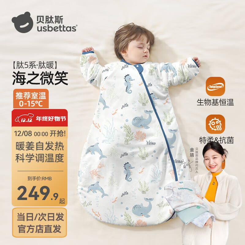 贝肽斯睡袋婴儿春秋恒温新生儿童宝宝睡袋一体式防踢被惊跳包被发热神器 海之微笑【冬季加厚 0-15°】 M码【适合身高62-85cm】建议年龄9个月-2岁