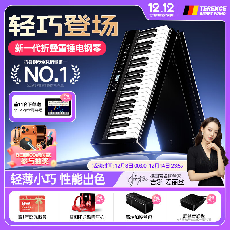 特伦斯(Terence)V60折叠重锤电钢琴88键电子钢琴成人儿童入门考级演出便携式电钢 V60典雅黑色+原装便携琴包+单踏板
