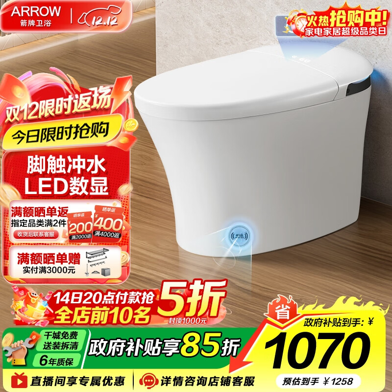箭牌(ARROW)智能马桶一体机即热式多功能冲水马桶恒温座圈除臭旋钮坐便器 脚触冲水/LED显示1133-S 305坑距