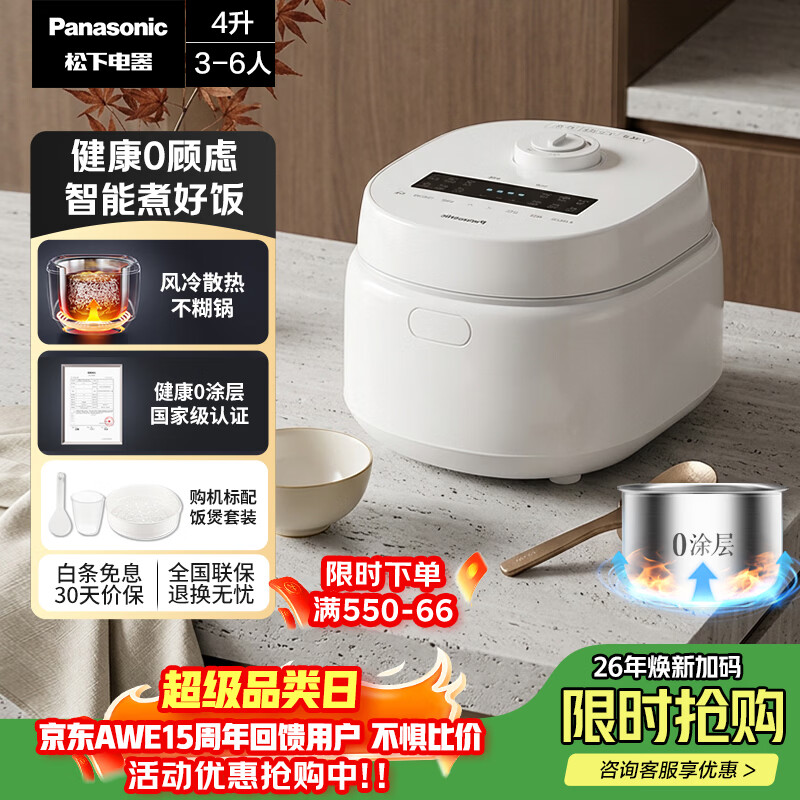 松下(Panasonic)【国家补贴】Xtra零零煲青春版电饭煲0涂层4-5人家用无涂层电饭锅不锈钢内胆煮饭4升容量SR-DKS151