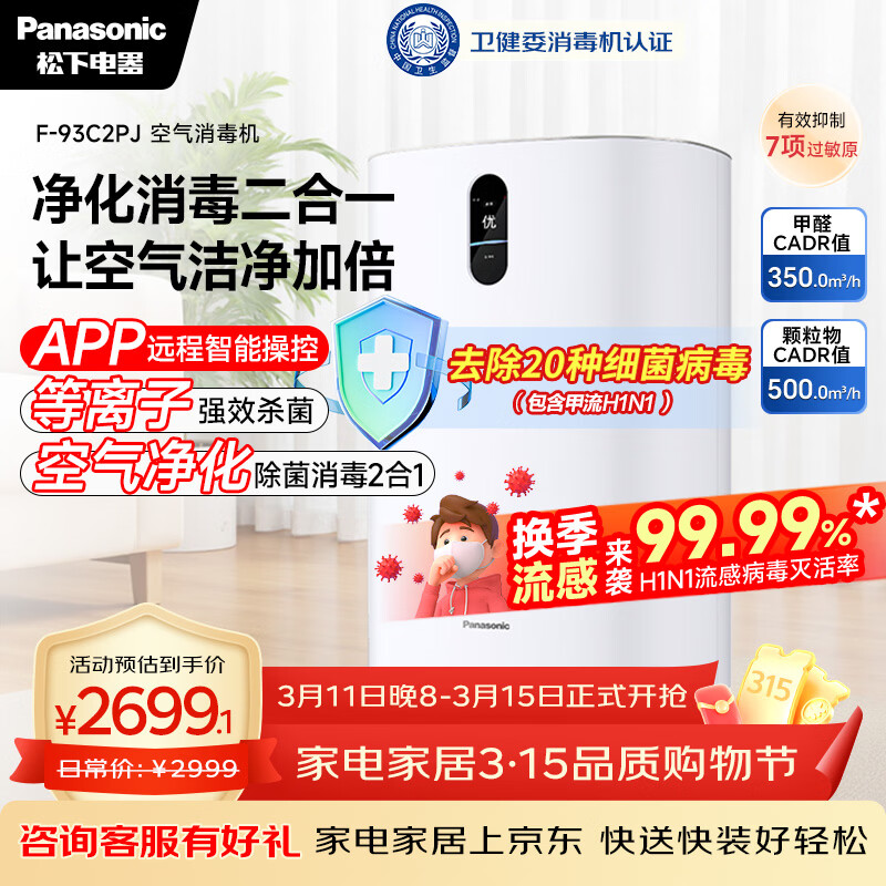 松下(Panasonic)家用空气净化器除甲醛卫健委备案空气消毒机 除菌除异味智能托管 净化机 93C2PJ礼品