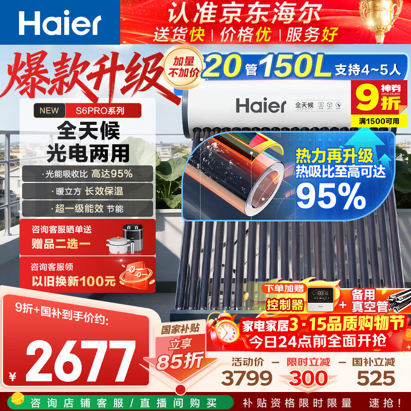 海尔(Haier)太阳能热水器家用光电两用一体式智能全天候一级能效WIFI智能预约 20管150升S6PRO (3-4人)