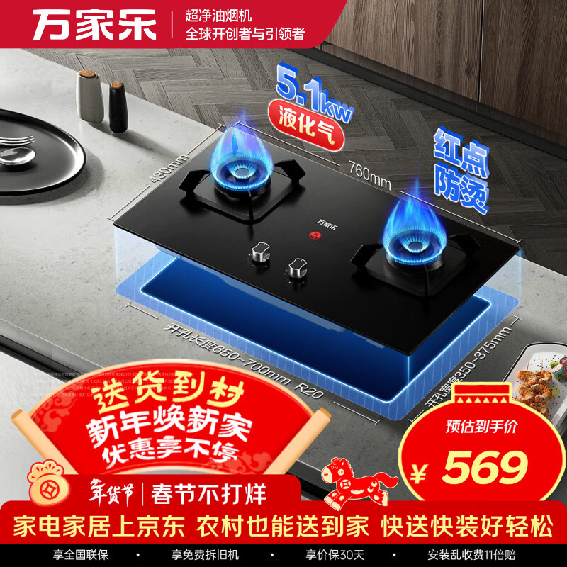 万家乐燃气灶【双高火TAC5液化气灶】立体全进风灶具 5.1kw火力家用嵌入式台式两用煤气灶具高温防烫提醒