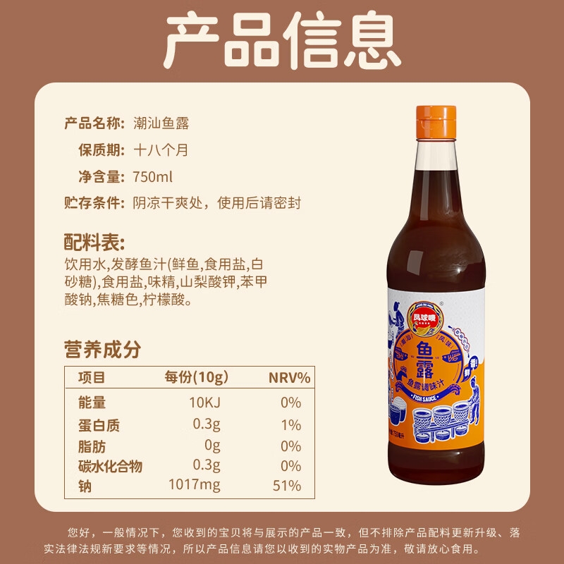 凤球唛鱼露750ml潮汕风味 【可代替盐】鱼酱油冬阴功增香提鲜调味料