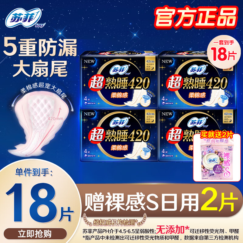 苏菲卫生巾超熟睡量多量大超长夜用日用日夜用姨妈巾组合装 棉柔夜用420mm16片【今日特慧】