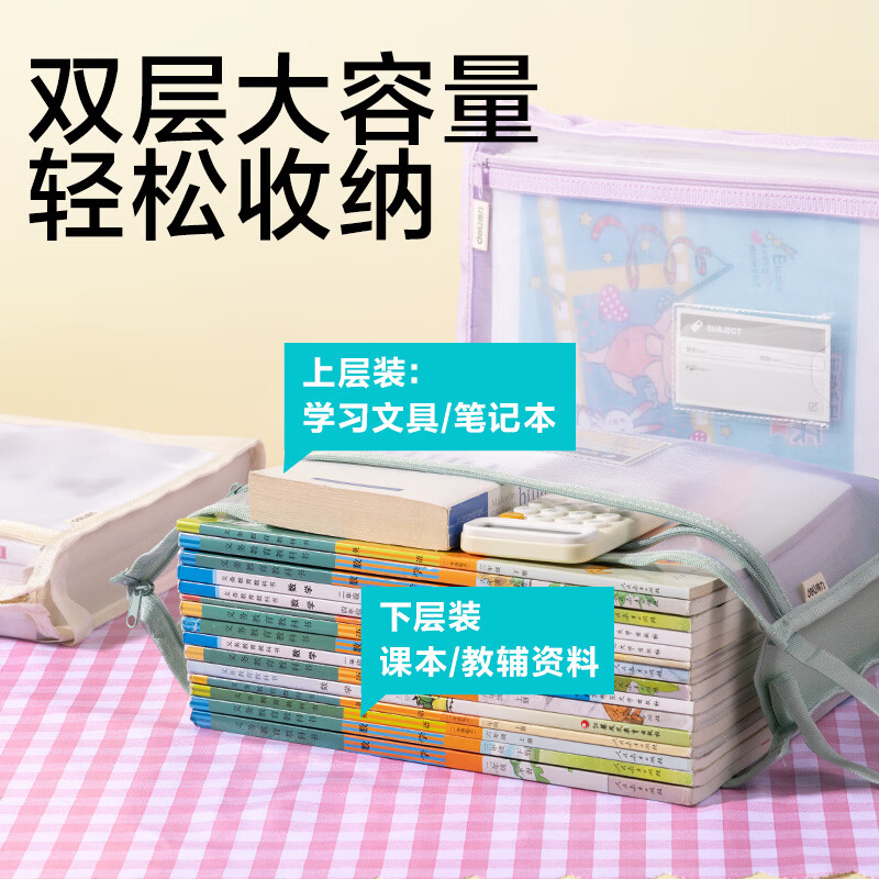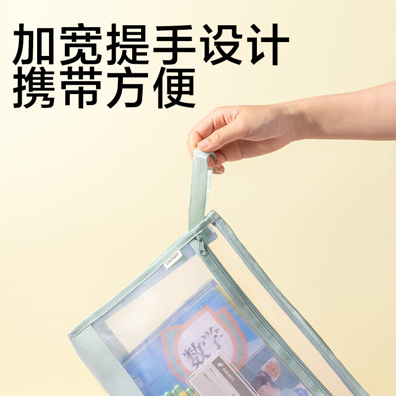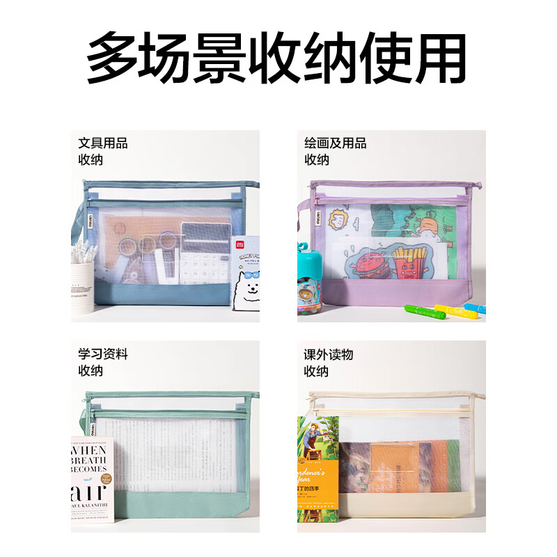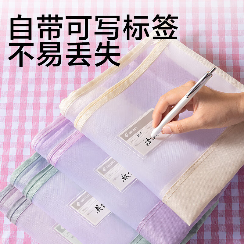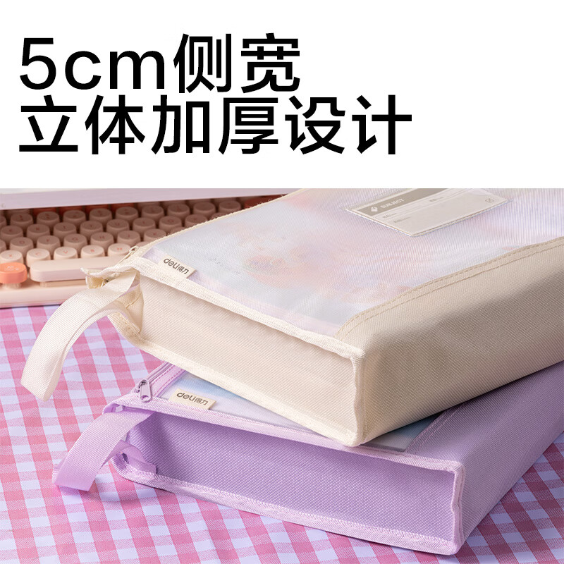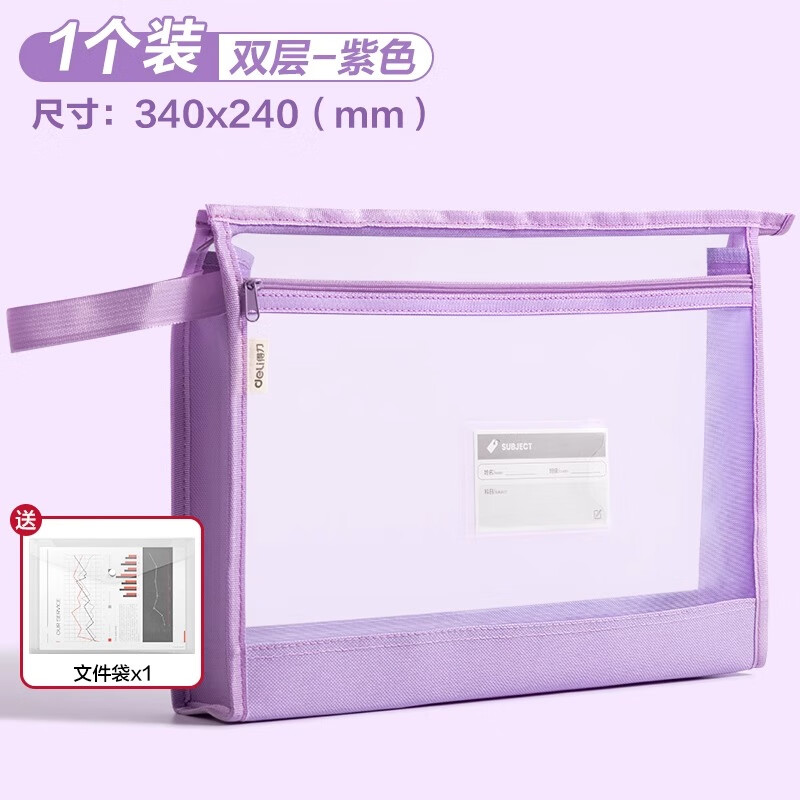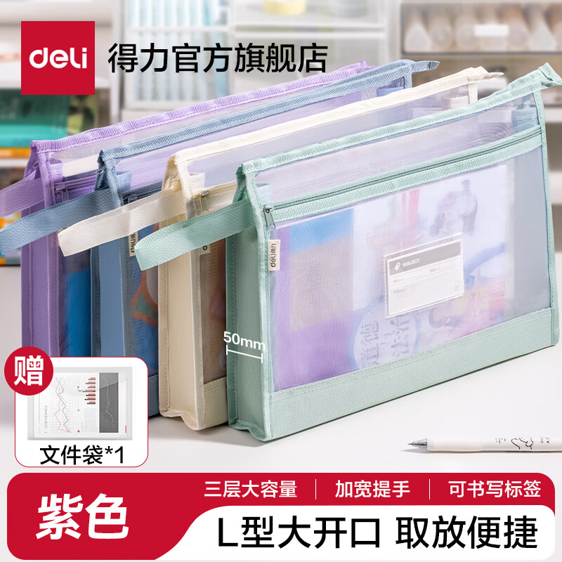 得力(deli)大背宽网纱拉链袋文件袋学科袋学科分类收纳袋透明档案中小学生科目试卷收纳装作业文具A4大容量 【紫色】5cm侧宽加厚-双层网纱拉链袋
