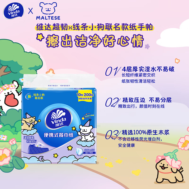 维达(Vinda)x线条小狗 超韧餐巾纸4层20片10包 大尺寸便携装小包方巾纸