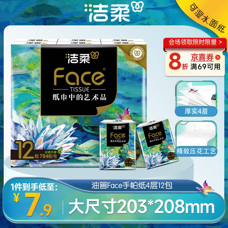 洁柔手帕纸4层7片*12包加厚湿水强韧艺术油画Face 随机包装发货
