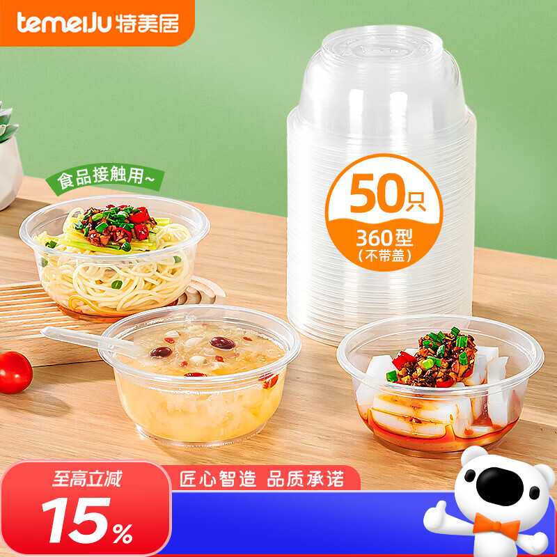 特美居(temeiju)一次性饭盒圆形餐盒野餐打包盒透明汤碗冰粉碗不带盖50只装360型