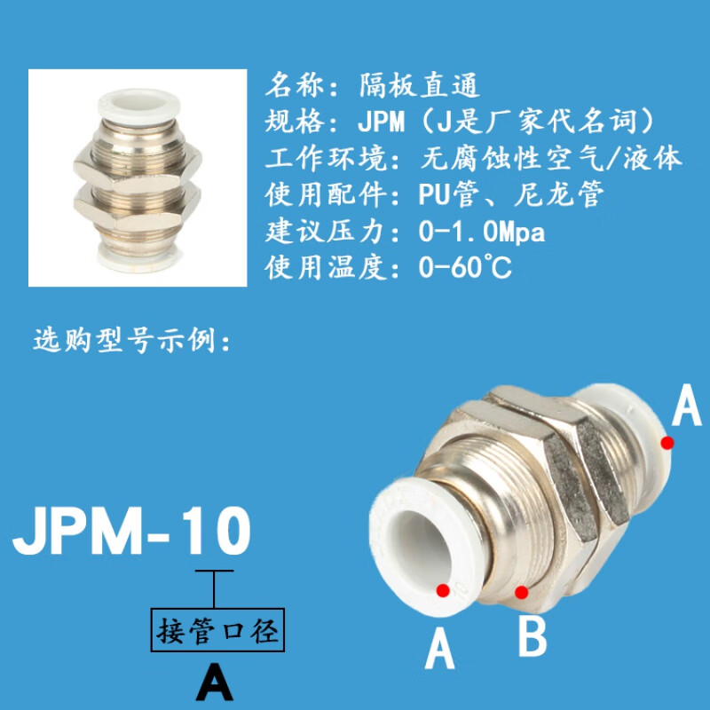 优依思气管隔板直通快插PM16接头气动亚德客型APM04PM6PM8PM10PM12的 JPM-04