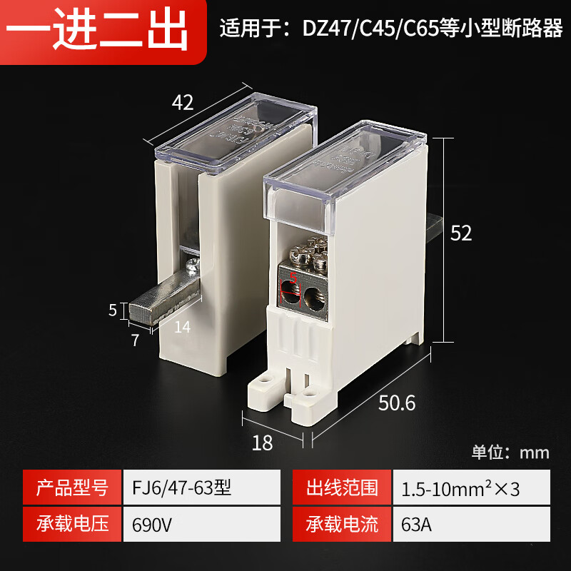 空开接线端子断路器分线盒空气开关接线盒一分二三分线器的 63型 一进二出