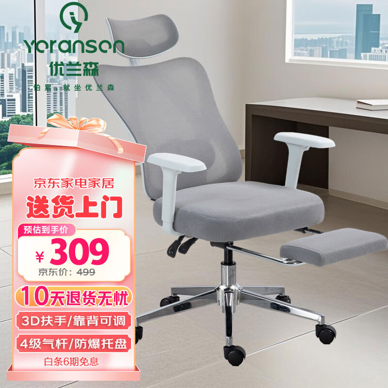 优兰森人体工学椅办公椅子电脑椅家用座椅电竞椅学习可躺久坐转椅W2026 W2026云白-3D扶手-有搁脚-钢制脚