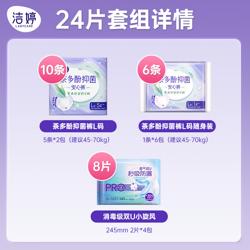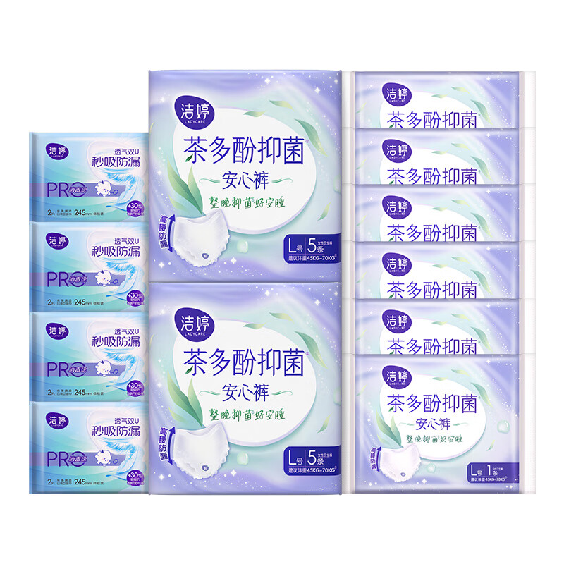 洁婷茶多酚抑菌安睡裤高腰防漏透气夜用大码卫生巾安心裤拉拉裤 L 24条 100-140斤 16条抑菌裤+8片卫生巾