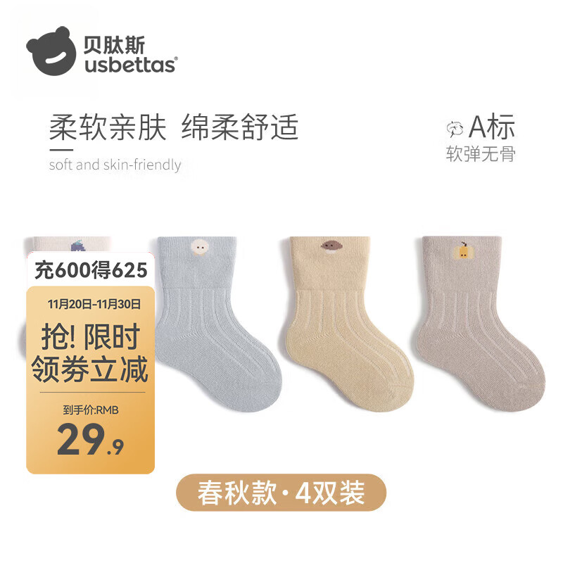 贝肽斯儿童袜子春秋季棉质新生婴儿棉袜宝宝秋冬季男童女童中筒袜精选 白色+蓝色+黄色+卡其色 4双 1-3岁
